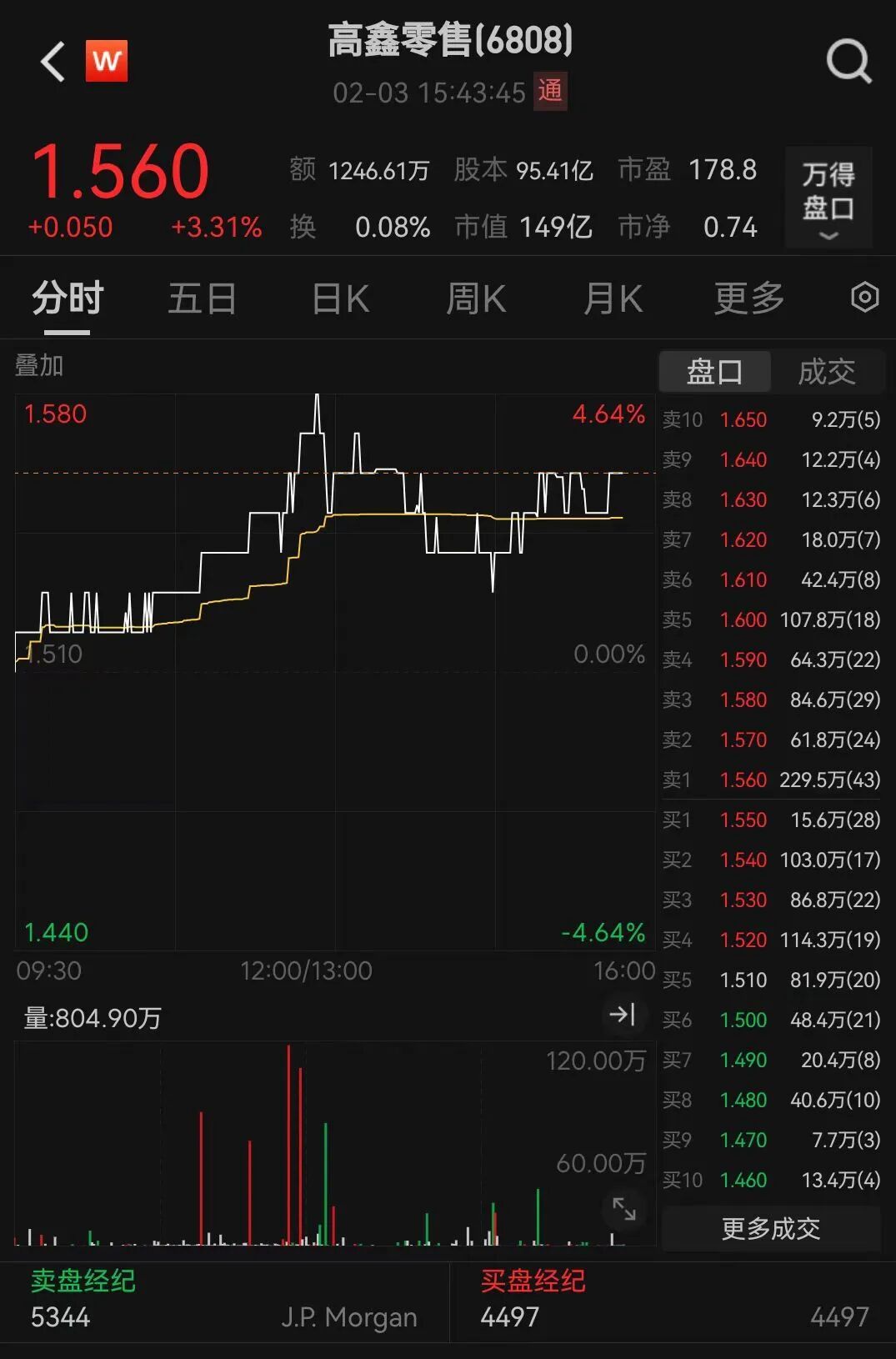 截至发稿,港股高鑫零售(6808.HK)涨3.31%,报1.560港元/美股。