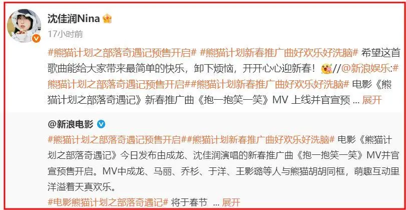 沈佳润的工作室突然发布消息,她将和成龙合唱电影《熊猫计划之部落奇遇记》的推广曲《抱一抱,笑一笑》。