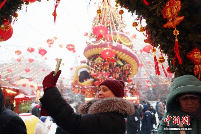 当地时间2月16日,中国农历除夕,第三届莫斯科“欢乐春节”活动在莫斯科市中心隆重启幕。图为俄罗斯民众在活动现场拍照打卡。中新社记者 田冰 摄