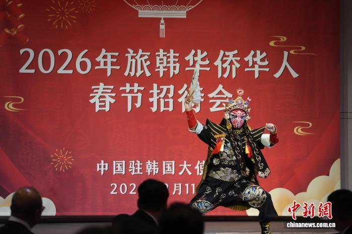 当地时间2月11日晚,中国驻韩国大使馆举办“2026年旅韩华侨华人春节招待会”。图为活动现场上演川剧变脸节目。中新社记者 刘旭 摄